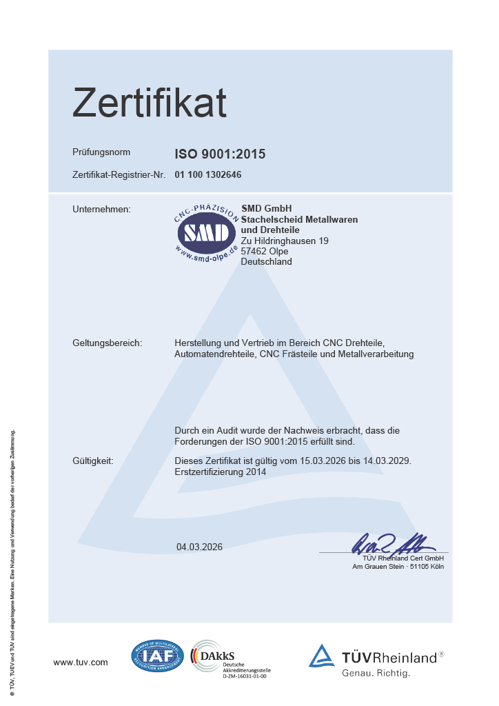 So können wir stets eine gleichbleibend hohe Qualität garantieren, welche auch durch die Zertifizierung nach DIN EN ISO 9001:2015 beschrieben ist.